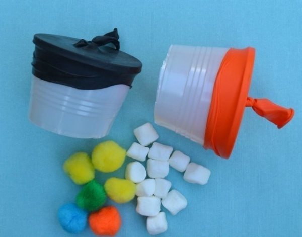Сделайте рогатку из пластиковых стаканчиков и воздушных шаров, которой можно пуляться маршмеллоу или помпонами.